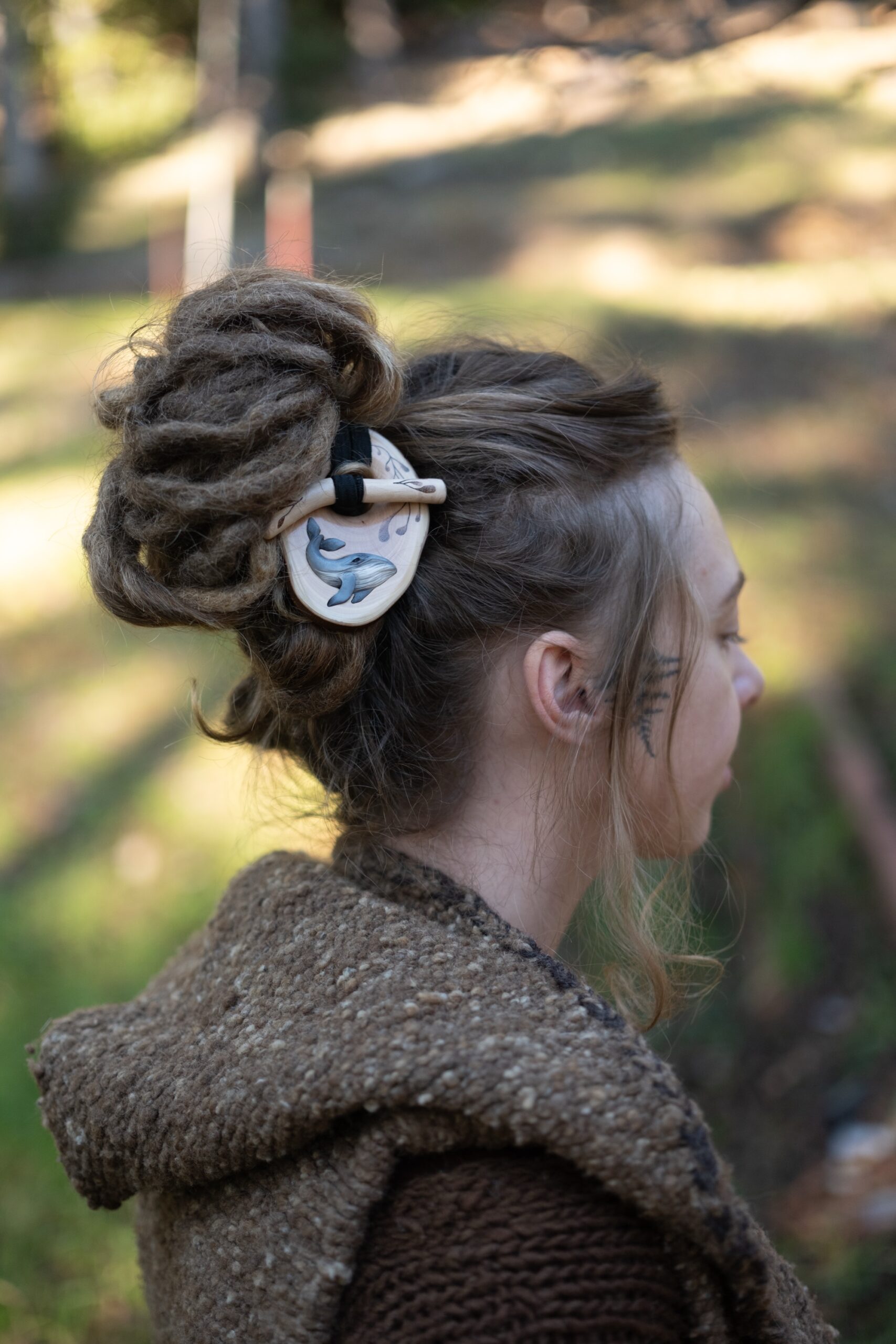Handmade madrone wooden toggle, ideal for dreadlocks but can be used to hold up any type of hair!