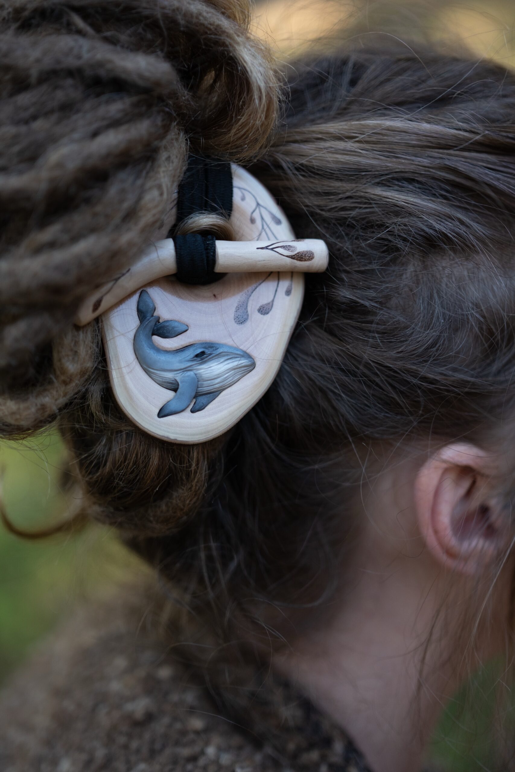 This toggle was handmade from madrone wood, engraved by hand, inlaid with a polymer whale clay design (not made by me!) and finished with organic lacquer. It comes with an extra large black hair tie + an extra tie for future needs.